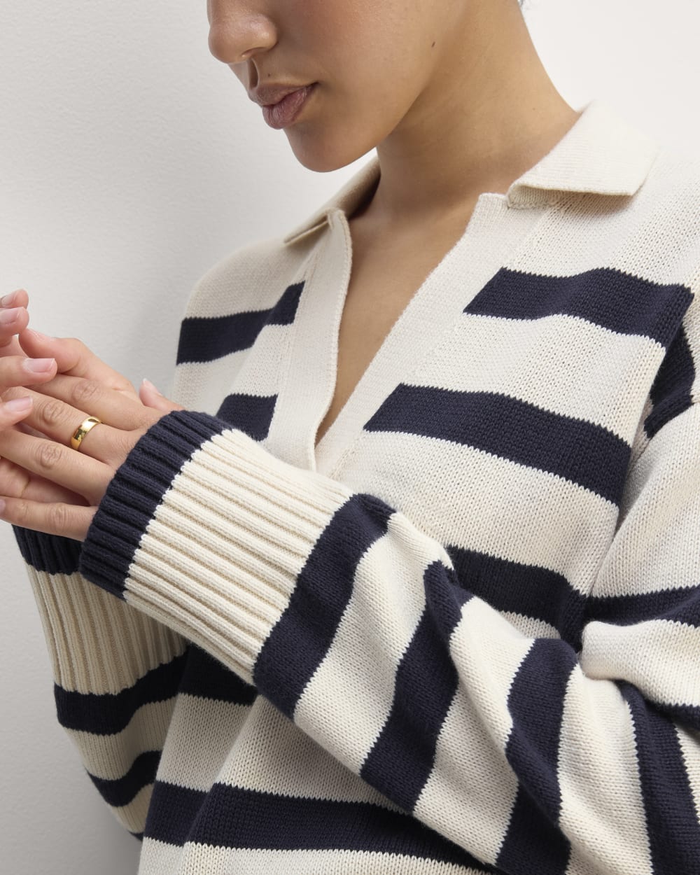 This piece features a classic polo neck. a boxy. relaxed fit. and wide straight sleeves with a chunky rib hem.