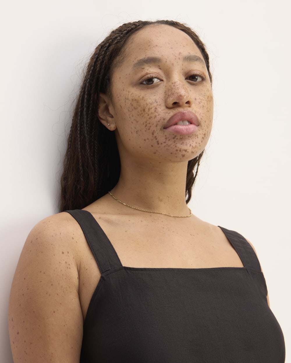 This piece features a relaxed fit. cropped straight leg. square neckline. elasticized back. side button detail with self covered buttons. a clean front. and made from 100% European Flax??Linen.