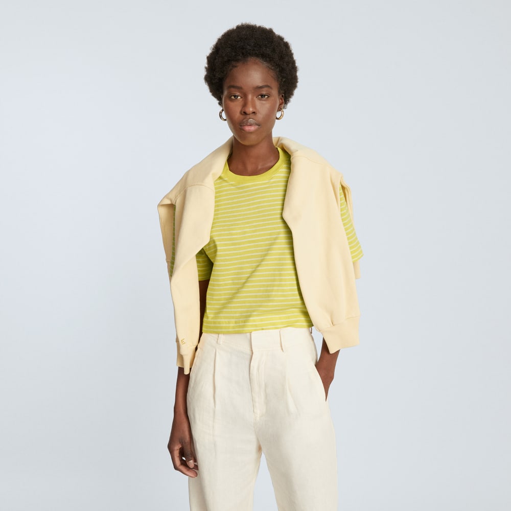 The Organic Cotton Cropped Tee features a classic crew neckline. elongated short sleeves. and a cropped. boxy shape that pairs perfectly with anything high-waisted. Even better? It’s made of 100% organic cotton.