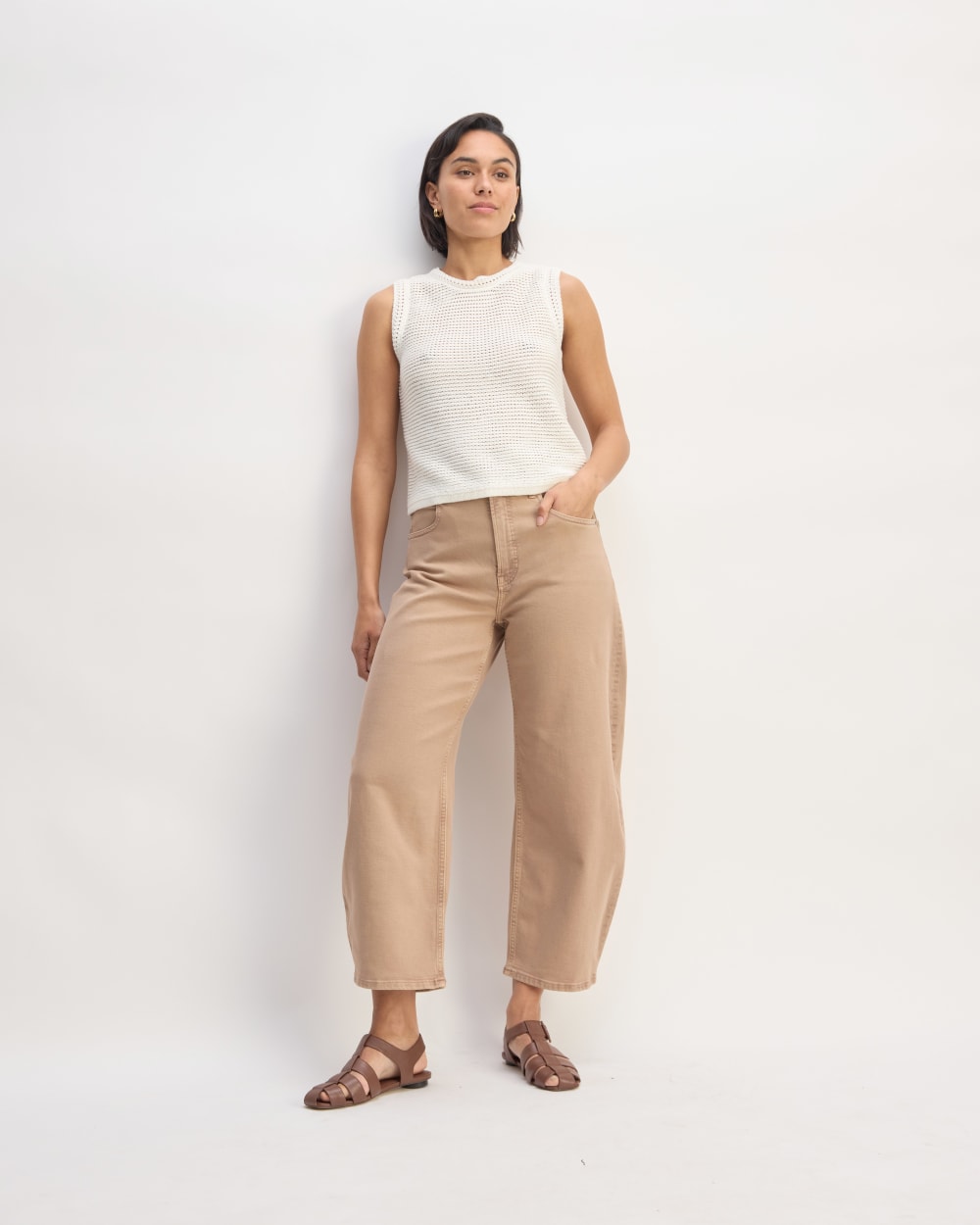 This piece features a relaxed fit. crew neckline. textured stitching. and wide crochet trim.