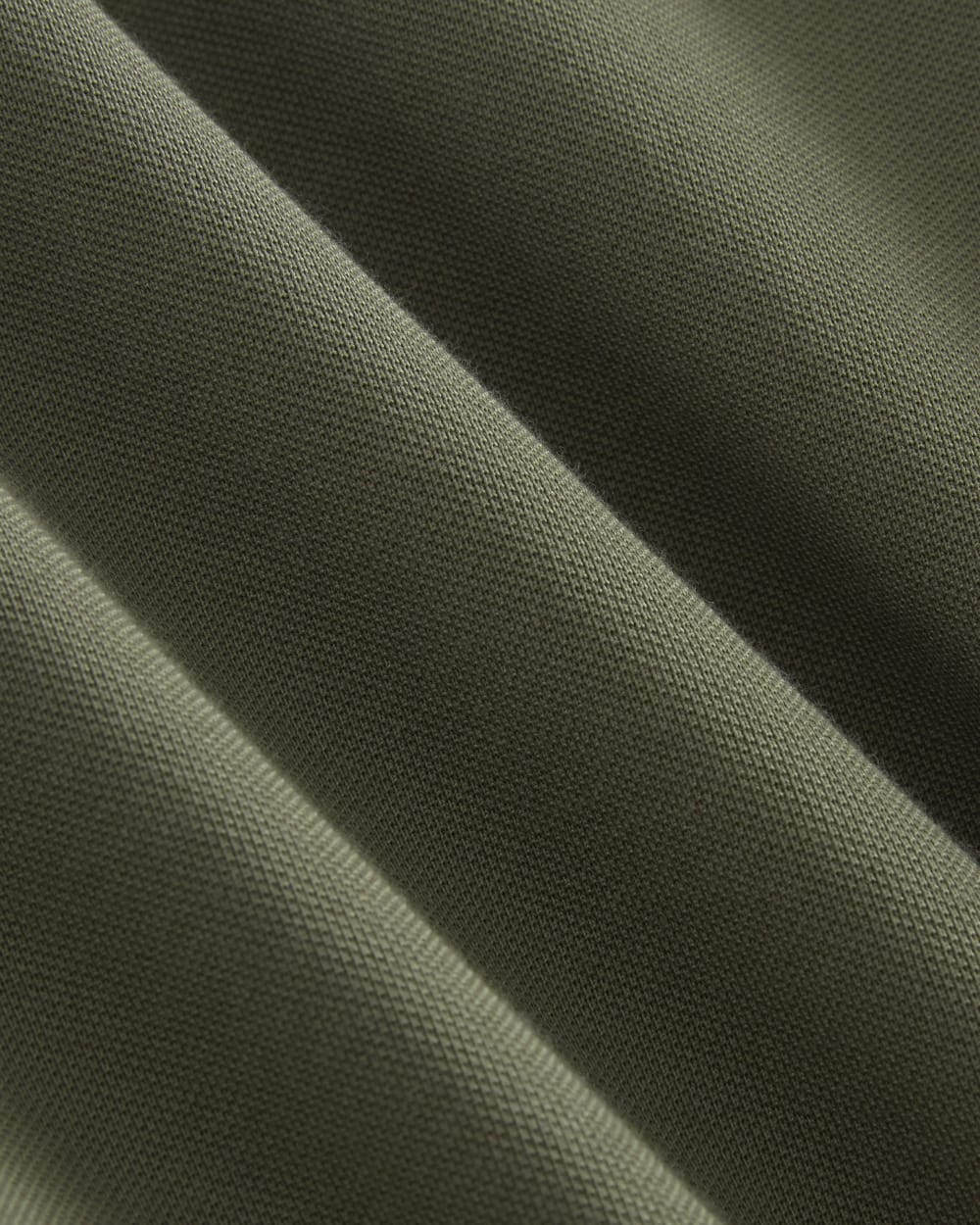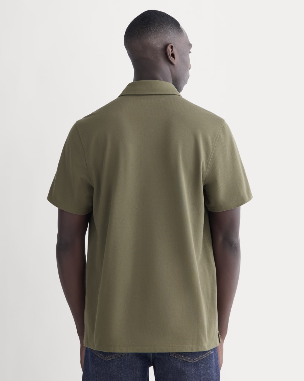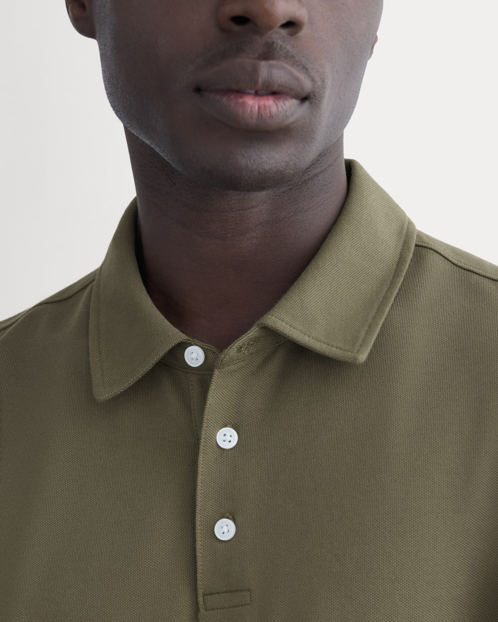This piece features a polo collar. button placket. slim fit. short sleeves. in a new regenerative cotton and recycled polyester performance fabric that’s moisture-wicking. quick drying. and breathable. with a little stretch.