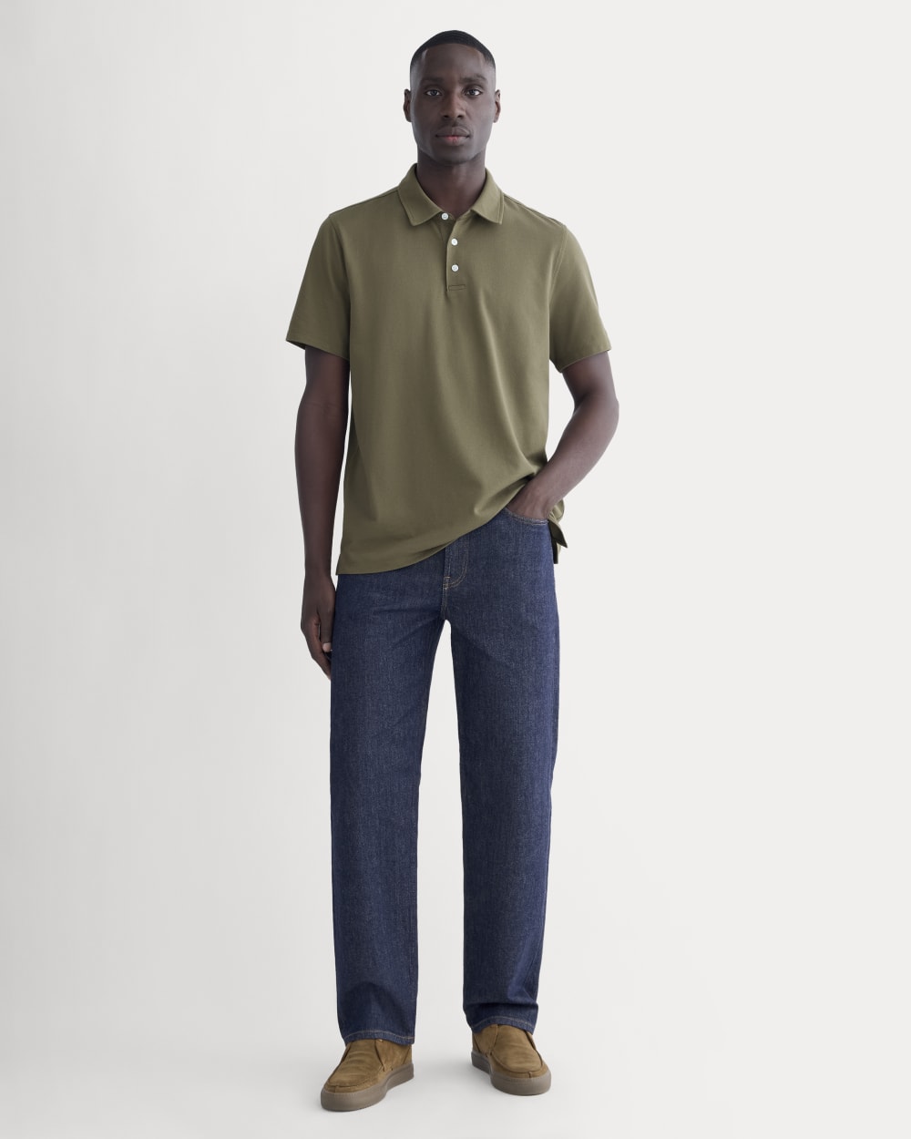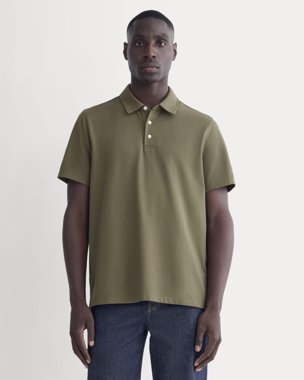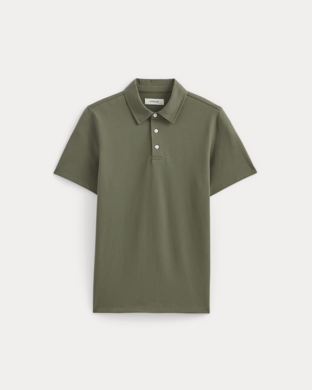 This piece features a polo collar. button placket. slim fit. short sleeves. in a new regenerative cotton and recycled polyester performance fabric that’s moisture-wicking. quick drying. and breathable. with a little stretch.