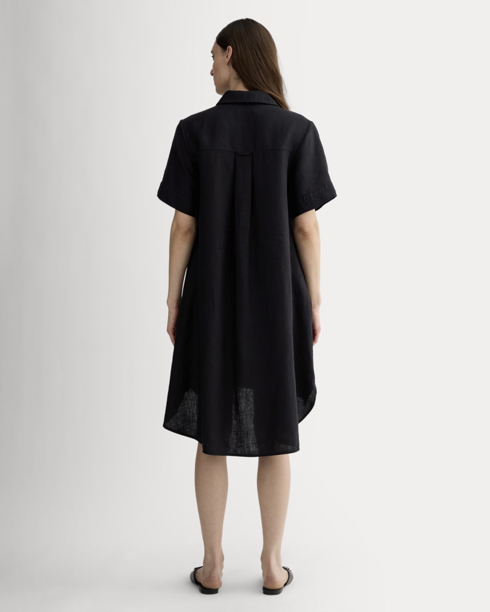 This piece features an oversized fit. point collar. button-front closure. chest pockets. short sleeves. and high-low hem.