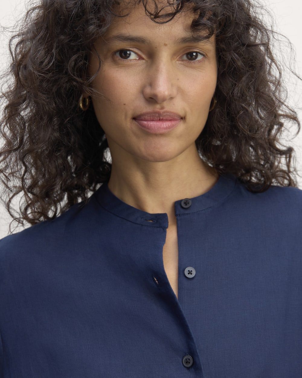 This piece features a stand collar neck. midi length. short sleeves. waist seam with darts for slightly fitted effect. on seam pockets. and front button closure. in European Flax? certified linen.